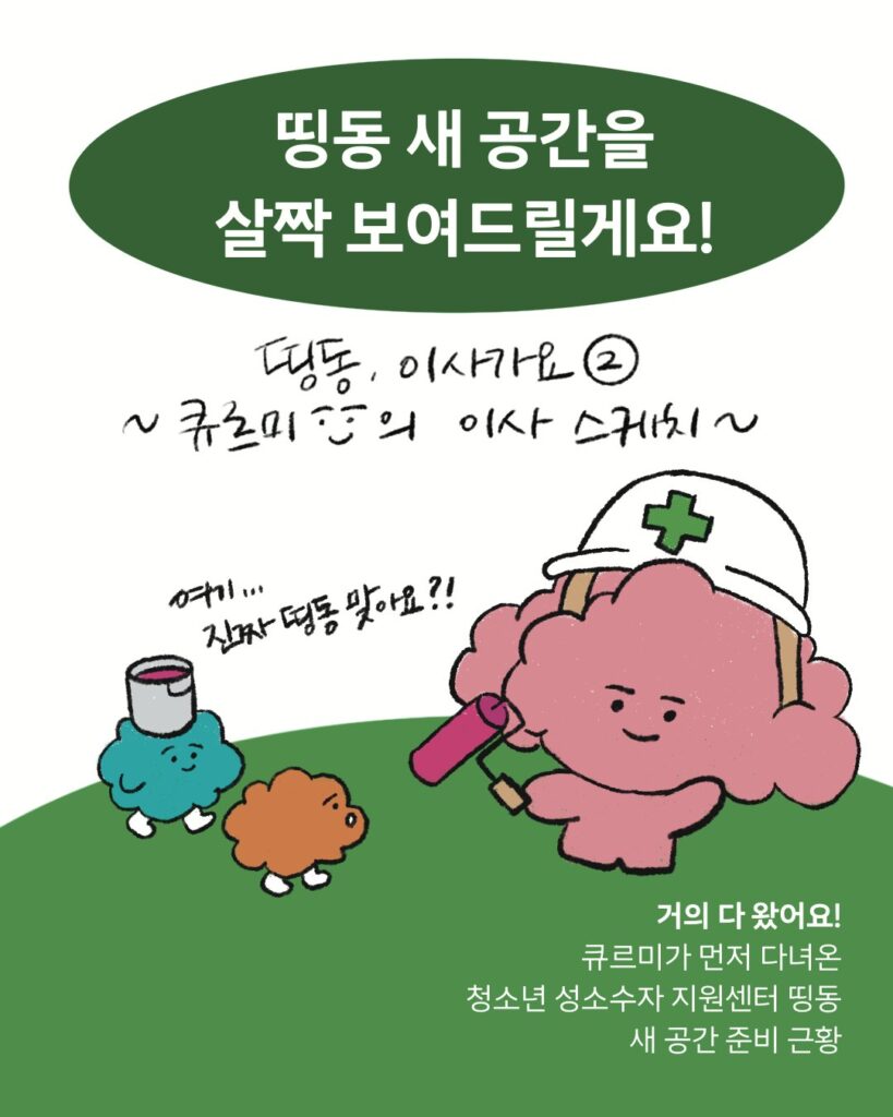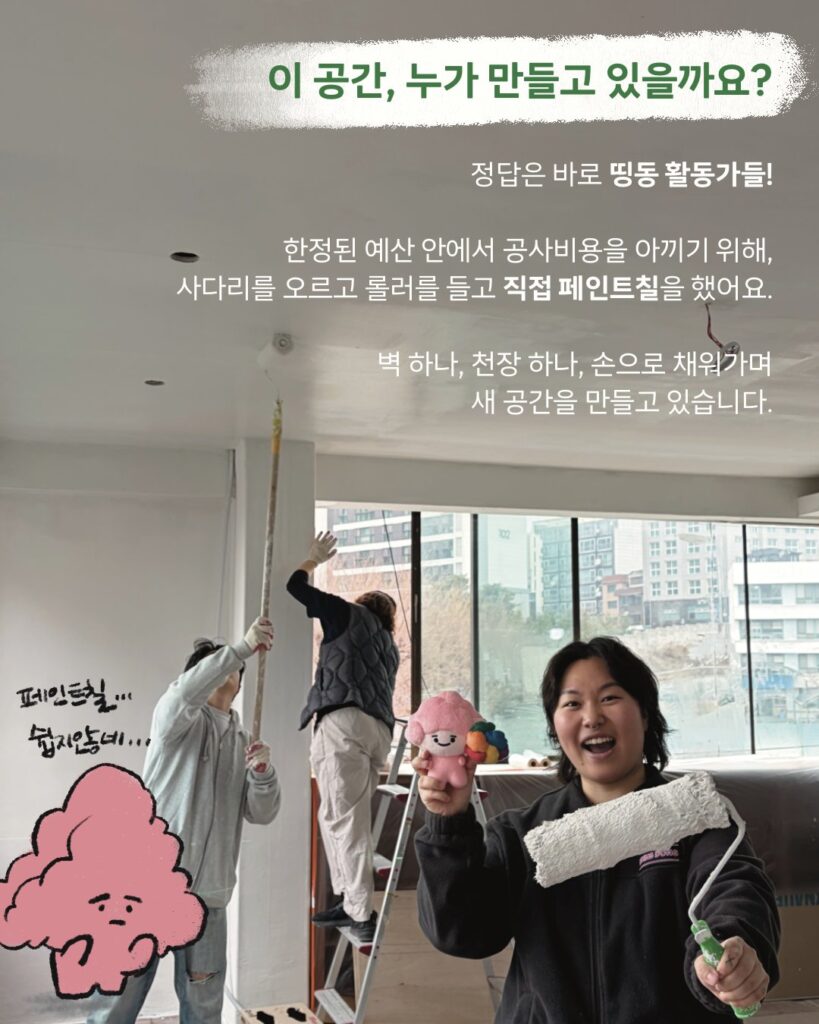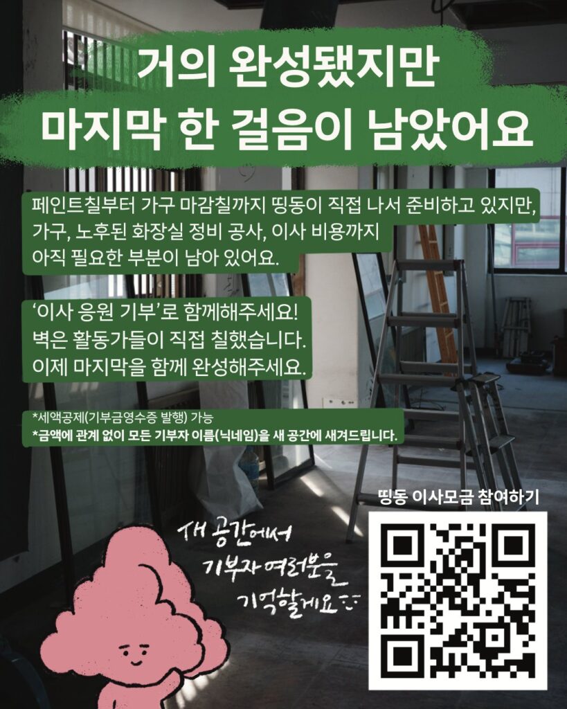 다행히 띵동은 새로운 공간을 찾았습니다! 한정된 예산 안에서 공사 비용을 아끼기 위해 띵동 활동가들이 직접 내부 공사를 돕고 있고, 아직 노후된 화장실을 정비하고 이사를 마치기 위한 비용을 더 후원받고 있다고 합니다.