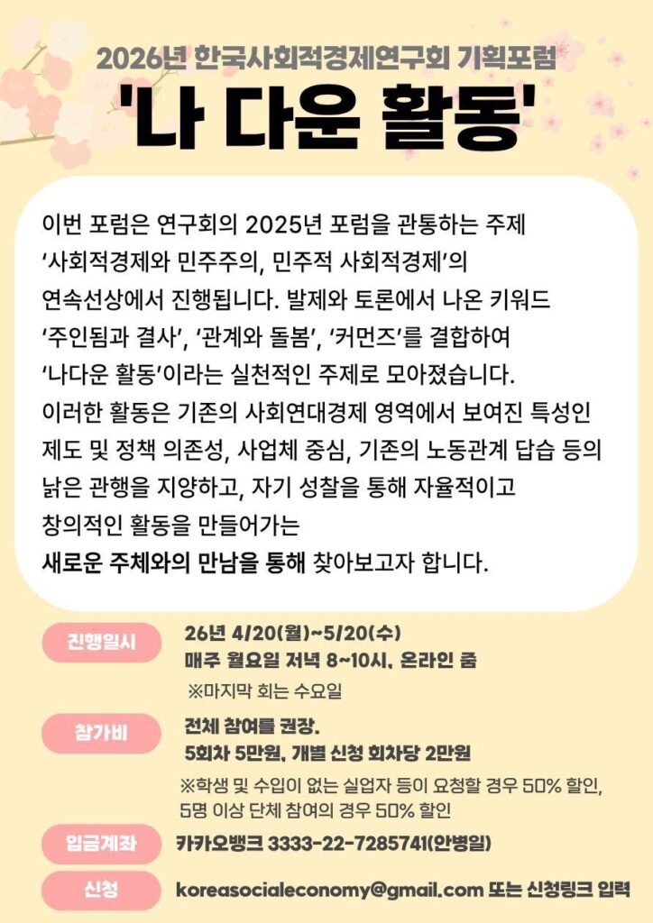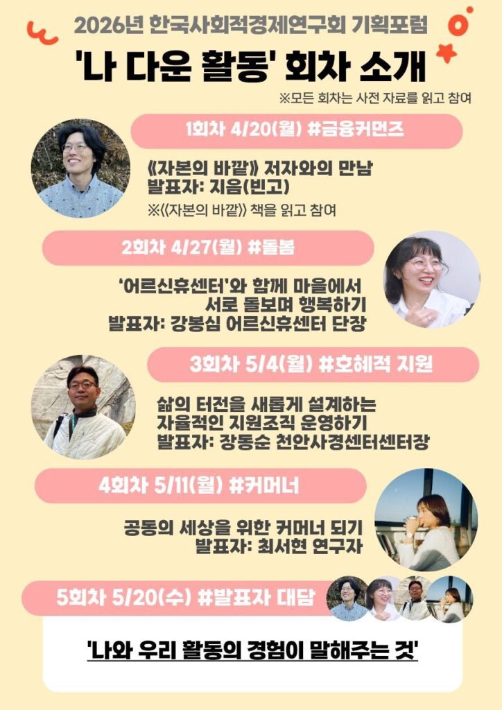 사회적경제연구회 기획포럼 ‘나 다운 활동’ 빈고게시판 한국사회적경제연구회에서 주최하는 기획포럼에 빈고에서 참여합니다. 관심있는 분들의 참여 바랍니다. 62026년 04월 09일2026년 04월 09일빈고게시판빈고