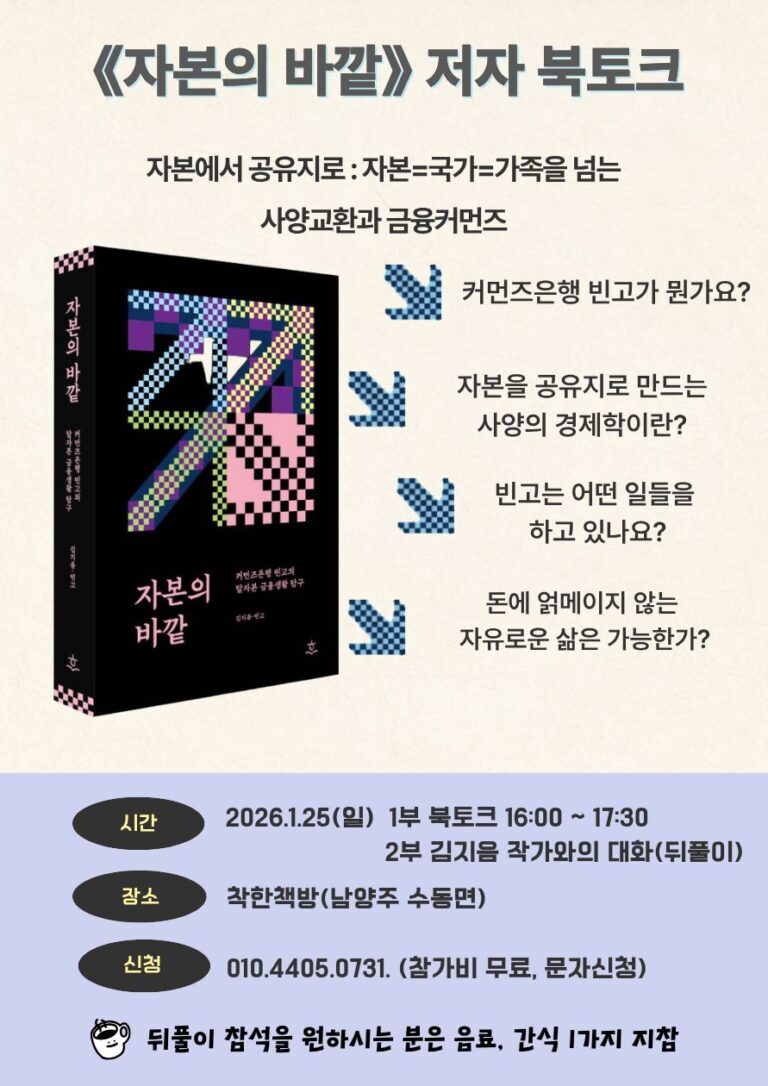 그래서 [자본의 바깥]은 설명을 요구하는 책이라기보다, 시간을 들여 함께 통과해보길 권하는 책에 가깝다. 단번에 이해되기를 기대하기보다는, 고개를 끄덕였다가 멈칫하고, 다시 돌아와 읽게 되는 책. 의미를 찾으려 애쓰지 않아도 어느 순간 몸 어딘가에 남아, 삶의 선택지를 조금 다른 방향으로 기울이게 만드는 책이다. 나는 오늘도 [자본의 바깥]의 다음 시간을 나대로 살아본다. 함께 한 그리고 함께 할 친구들에게 ‘살아보니 넌 어때?’ 하고 다정하게 질문하는 순간들을 더 많이 가지길 기대하면서.”
