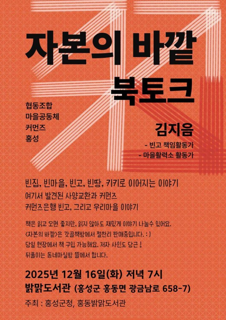 홍성 밝맑도서관 북토크 빈고게시판 충남 홍성 밝맑도서관에서 북토크를 합니다.홍성군 홍동면은 가장 먼저 생긴 신협의 하나인 풀무신협이 있고,무이자은행 도토리회가 있고,지역화폐 잎이 있는 곳입니다.뭔가 또 새로운 일들이 생기면 좋겠습니다. 일시 : 2025년 12월 16일 19:00 장소 : 홍성군 홍동면 밝맑도서관 자본의 바깥 계속 읽기 102025년 12월 08일빈고게시판빈고자본의 바깥