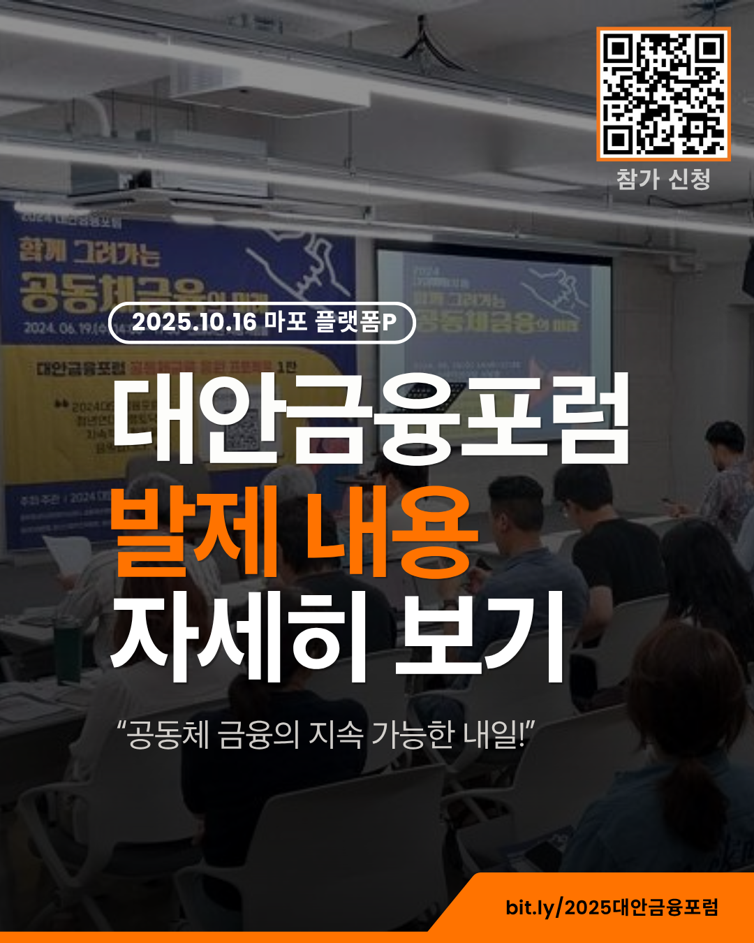 2025 대안금융포럼 발제내용 자세히 보기 빈고게시판 10월 16일(목) 마포 플랫폼P에서 “2025 대안금융포럼”을 엽니다! 발제 내용을 상세히 소개해 드립니다. 공동체와 지역에서 가치 기반의 대안금융 만들고, 지속가능하게 운영하기 위해 여러 단체, 활동가들이 머리를 맞대고 뜻을 모으는 자리입니다. 함께 오셔서 연대의 네트워크 만들어 가면 좋겠습니다! • 참가 신청: https://bit.ly/2025대안금융포럼 362025년 10월 15일빈고게시판빈고