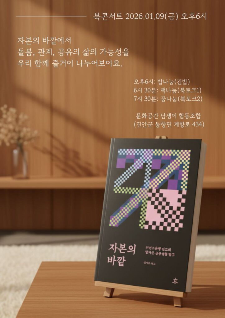 260109 진안 북콘서트 빈고게시판 진안에서도 반달 대표님이 준비해주셔서 북콘서트를 진행합니다. 일시 : 2026년 1월 9일(금) 오후 6시 장소 : 문화공간 담쟁이 (진안군 동향면 계향로 434) 진행 6:00 밥나눔(김밥) 6:30 책나눔(북토크1) 7:30 꿈나눔(북토크2) 자본의 바깥에서 돌봄, 관계, 공유의 삶의 가능성을 우리 함께 즐거이 나누어 보아요. 442025년 12월 22일2025년 12월 23일빈고게시판빈고자본의 바깥