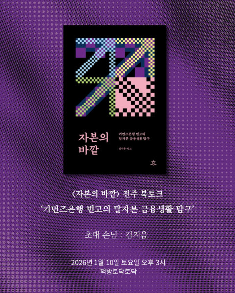 260110 전주 토닥토닥책방 북토크 빈고게시판 전주 토닥토닥 책방에서 초대해주셔서 북토크 진행합니다. 사전에 책모임도 하신다고 합니다. 전주 인근 분들의 많은 참여 바랍니다. 고맙습니다. 일시 : 2026년 1월 10일(토) 15:00 장소 : 전주 책방토닥토닥 (전주시 완산구 풍남문2길 53 남부시장 2층 청년몰) 412025년 12월 22일2025년 12월 22일빈고게시판빈고자본의 바깥