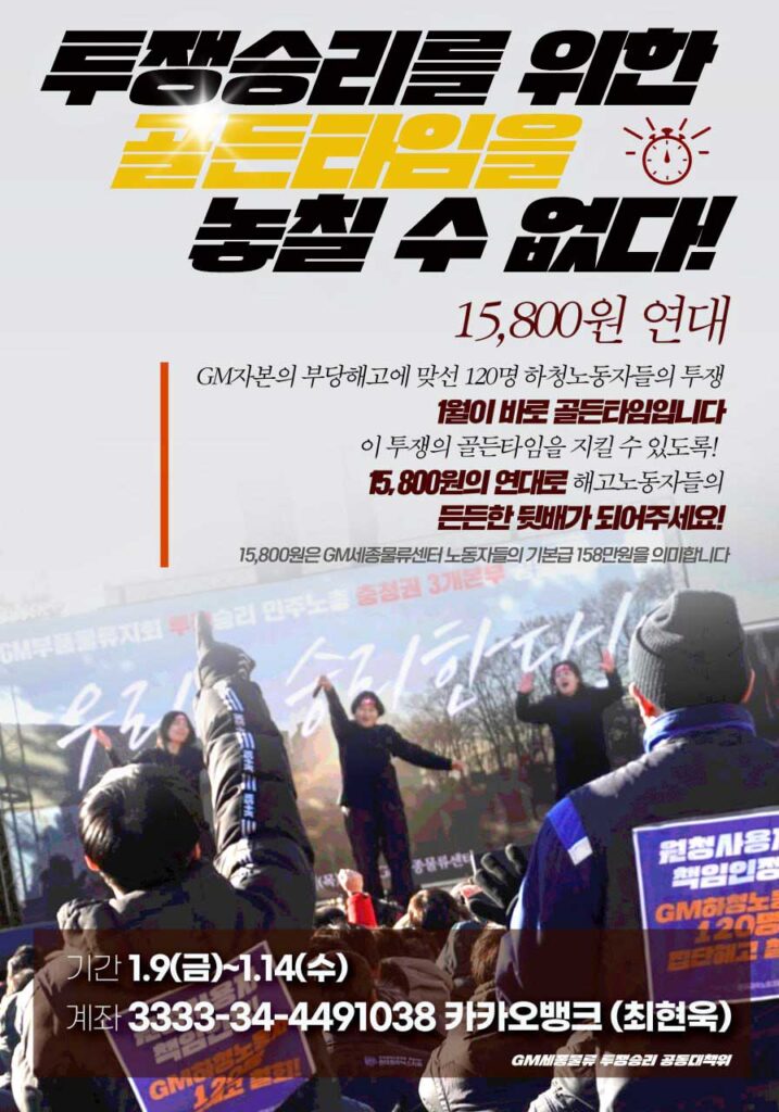 현재 투쟁의 골든타임인 1월을 놓치지 않겠다고 노동자들의 기본급 158만원을 의미하는 15,800원의 투쟁 기금을 모금하고 있습니다.